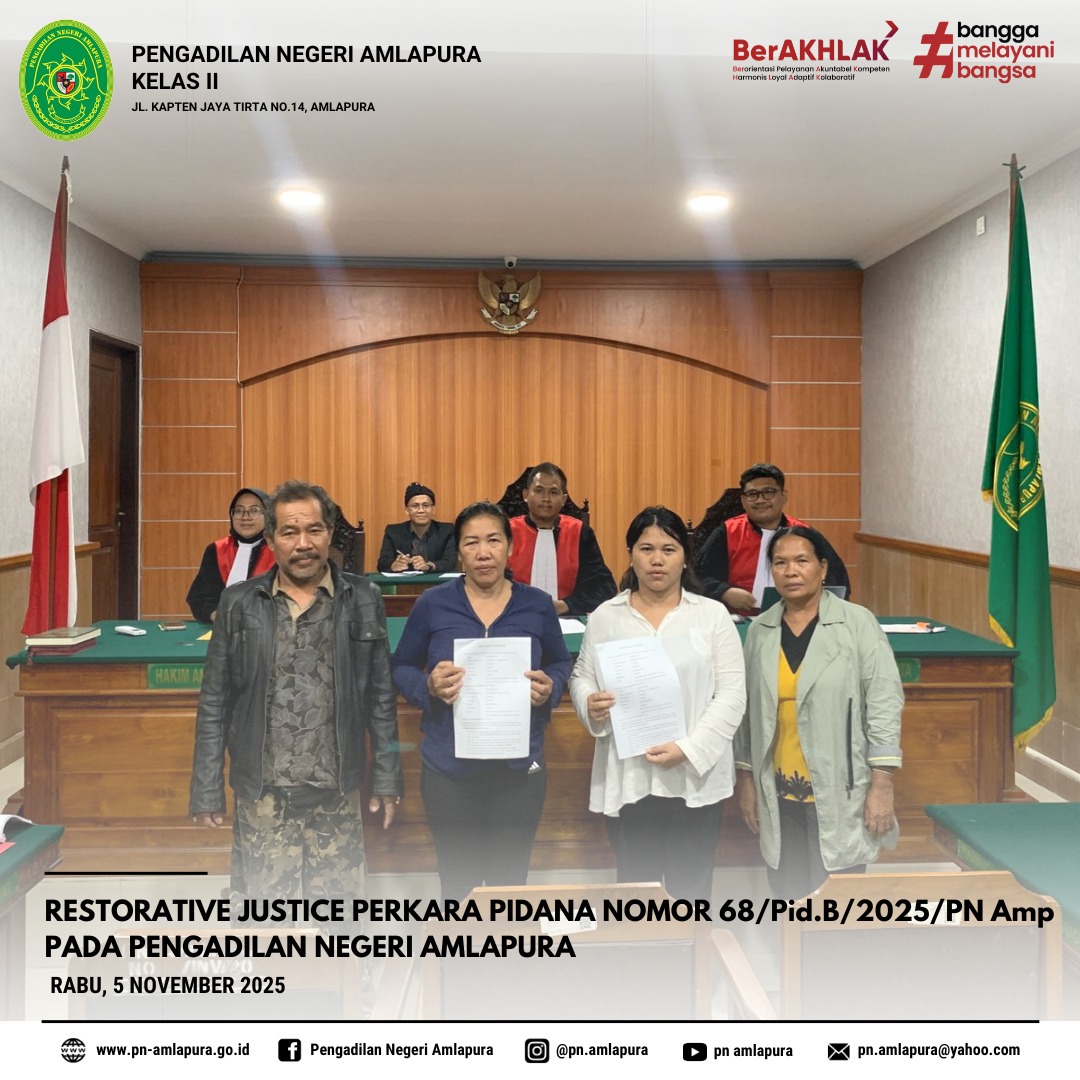 Bertempat di Ruang Sidang Pengadilan Negeri Amlapura. Majelis Hakim Bapak Evander Reland Butar Butar, S.H.,M.H., Bapak I Putu Gede Yoga Pramana, S.H, dan Ibu Rizki Ridha Damayanti, S.H.,M.H. berhasil menerapkan keadilan restoratif pada perkara pidana No. 68/Pid.B/2025/PN Amp.